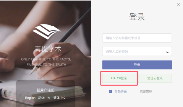本校师生使用青提学术(NoteExpress Web)须用CARSI认证进行机构注册。注册后方可享受本校拥有的机构特权。